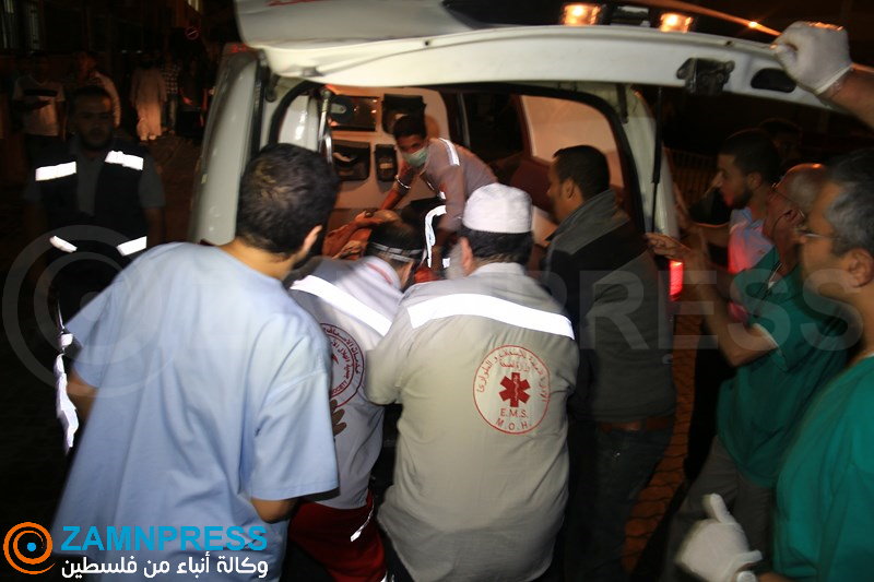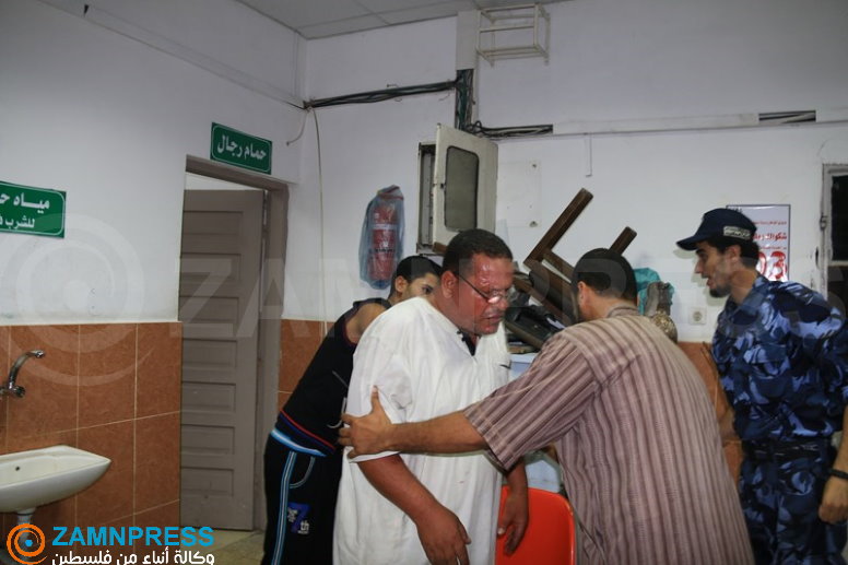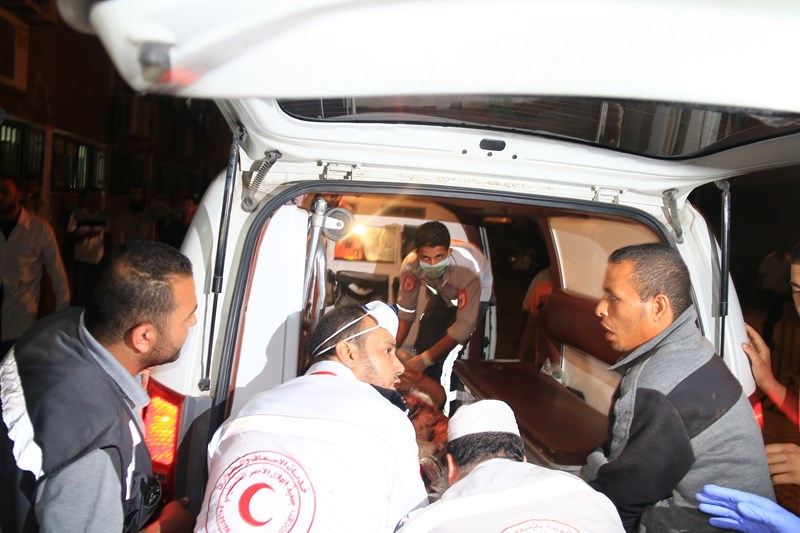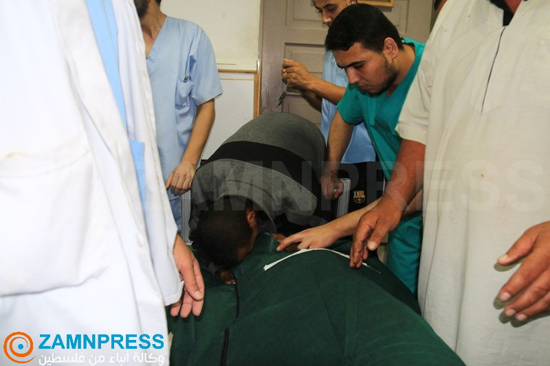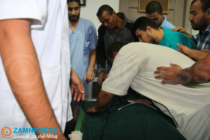 لحظة وصول جثمان الشهيد بسام أبو عزب إلى مجمع ناصر الطبي وعدد من أفراد عائلته إلى مجمع ناصر الطبي بعد استهداف قوات الاحتلال لهم في منطقة المنارة بخانيونس. عدسة: سعيد قديح