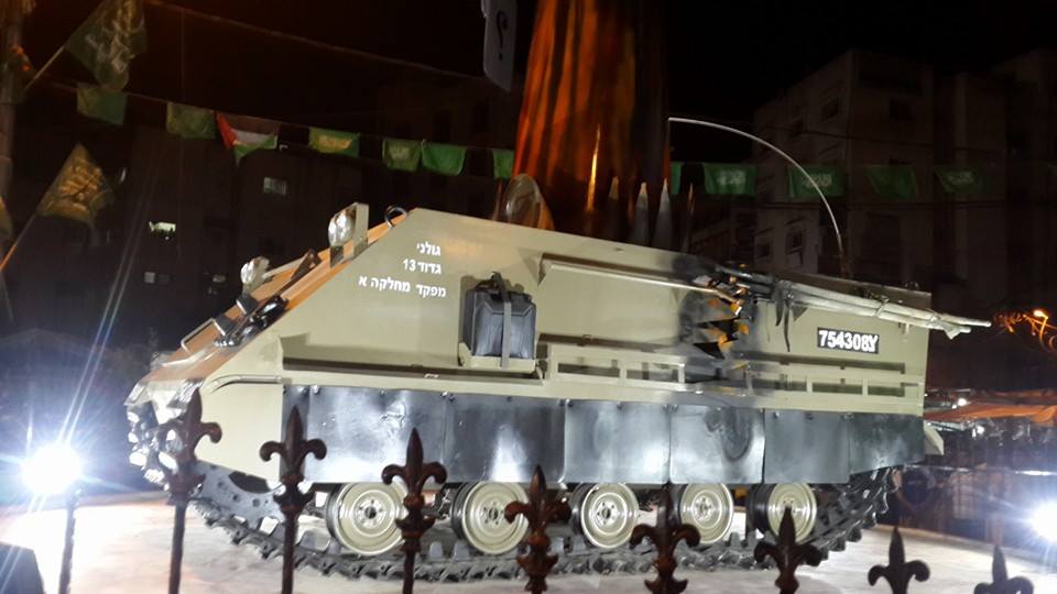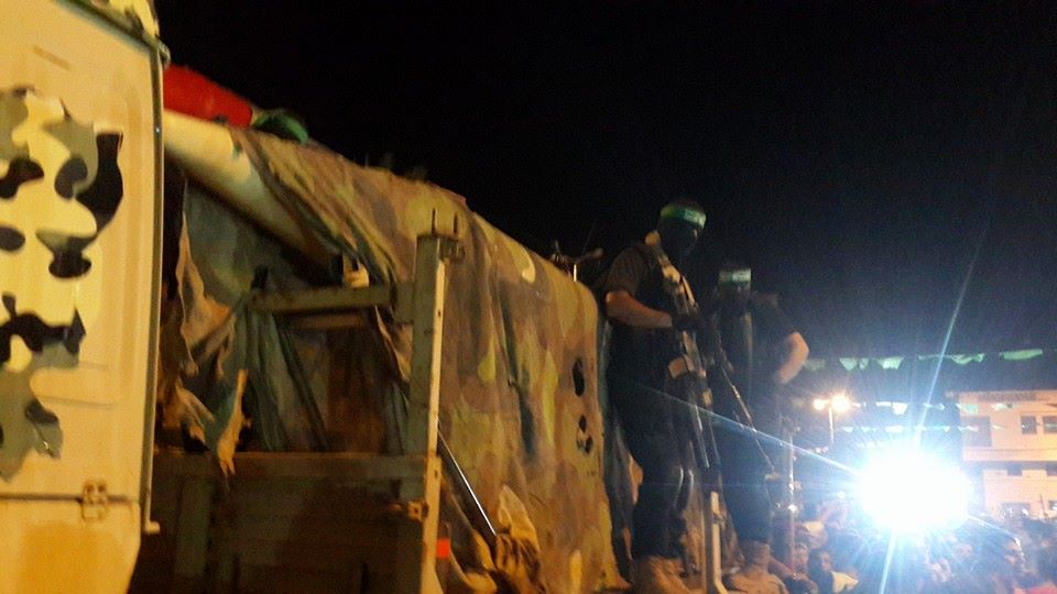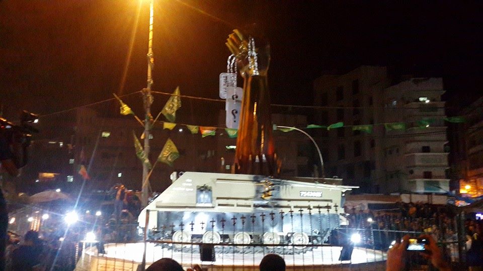 وشهد العرض الذي نظّمته كتائب القسام وضع نصب تذكاري في ميدان فلسطين لناقلة الجند التي أسر منها الجندي الإسرائيلي شاؤول أرون في حي الشجاعية خلال المواجهة الأخيرة التي استمرّت 51 يومًا.