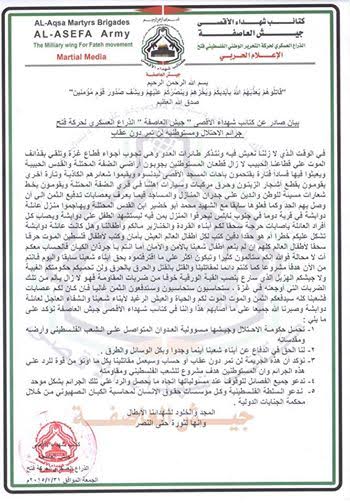 بيان صادر عن كتائب شهادء الأقصى