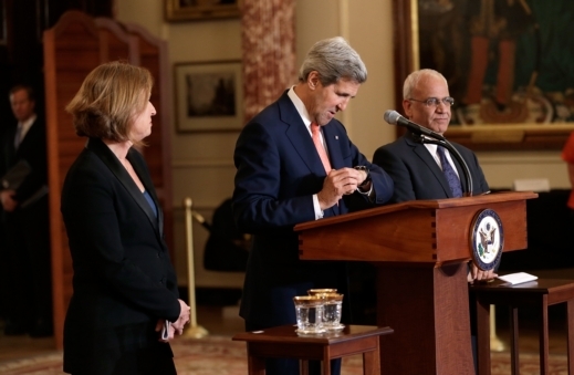 بعد اللقاء مع اوباما اجتمع نتنياهو مع وزير الخارجية الامريكي جون كيري في وزارة الخارجية في واشنطن. وقد أجرى كيري أول أمس مكالمة هاتفية مع الرئيس عباس. وتناول جزء كبير من اللقاء بين كيري ونتنياهو مسيرة السلام مع الفلسطينيين والحاجة الى تعجيلها. وأبلغ نتنياهو كيري عن مضامين خطبته في الجمعية العمومية للامم المتحدة اليوم (امس) التي سيتناول فيها ايضا القضية الفلسطينية، وأكد كيري له التزامه بأمن اسرائيل.