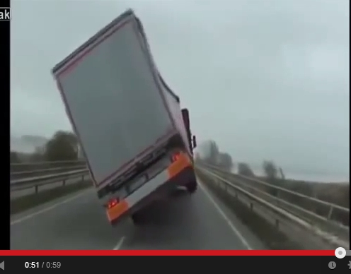 بالفيديو: رياح عاتية تُقلب شاحنة ضخمة متوقفة