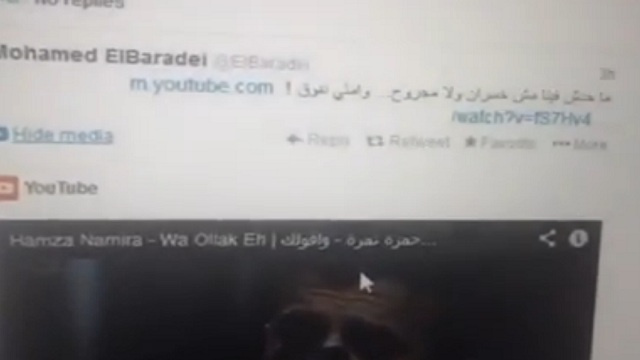 القاهرة: تحول محمد البرادعي نائب الرئيس المصري دون علمه إلى كاتب كلمات أغنية، أو بالأحرى جملة موسيقية، إذ استلهم الفنان عمرو مصطفى لحنا من تعليق نشره البرادعي على صفحته في موقع "تويتر"، فأدى هذه الجملة القصيرة في تسجيل قصير. تقول كلمات البرادعي .. "ما حدش فينا مش خسران ولا مجروح .. وامتا نفوق"، وربما أصبحت هذه الكلمات أول عبارة مشاركة في أحد مواقع التواصل الاجتماعي تتحول إلى عبارة (جملة) موسيقية كما أفاد موقع "روسيا اليوم".