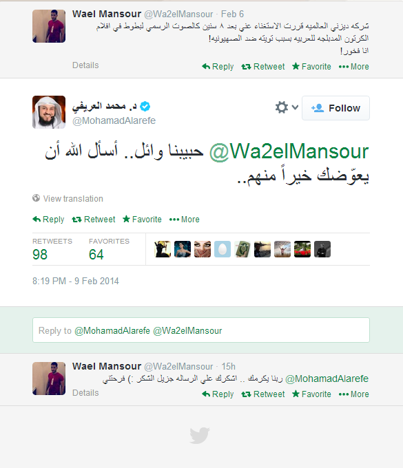 وردّ الشيخ العريفي على منصور قائلاً " حبيبنا وائل.. أسأل الله أن يعوّضك خيراً منهم..".