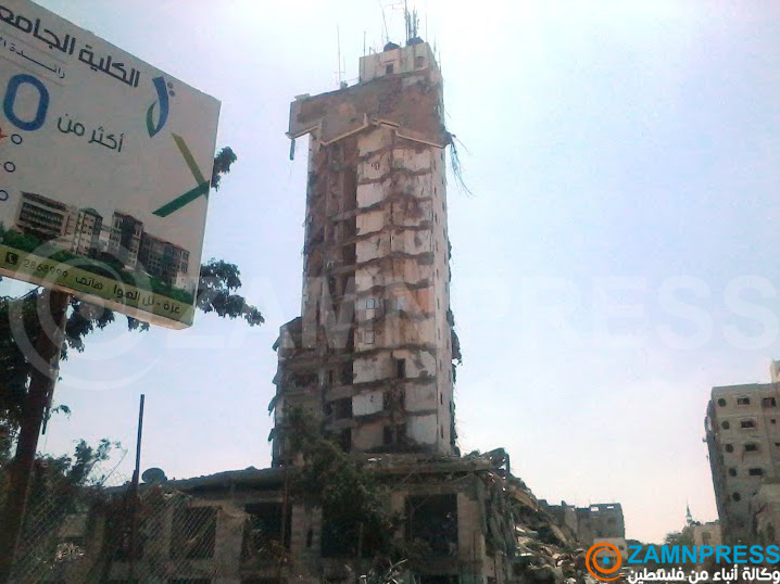 برج مكون من 15 عشر طابقاً لم يتبق منه سوى المكان المخصص للمصعد، حيث لا يمكن الاستفادة منه، كما لا يمكن أن يبقى هكذا فهو يشكل خطراً على حياة الناس والمنازل المحيطة به.