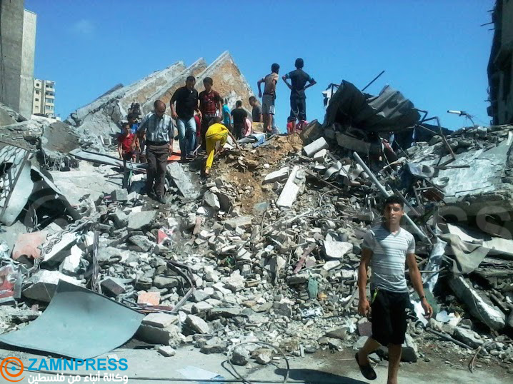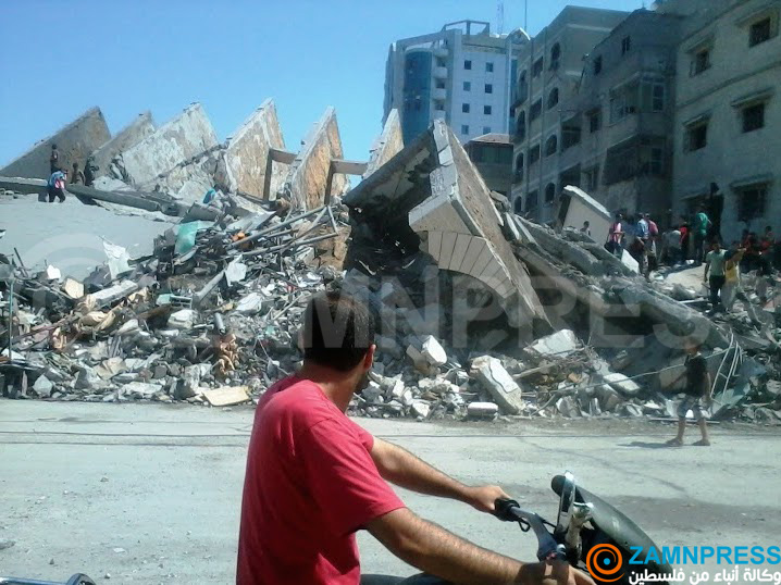 أما جمال أبو القمصان وهو فنان فجاء يتفقد البرج الذي انهار ووقف ليس ببعيد عنه يتأمله ويحاول أن يعرف أين هو مكان مكتبه او ما كان مكتبه قبل ساعات قليلة فقط، ويتابع الأطفال الذين يتراكضون فوق الركام لعلهم يجدون ما يمكنهم إنقاذه من بقايا القصف.
