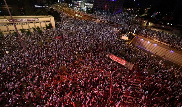 زمن برس، فلسطين: تظاهر عشرات الآلاف في تل أبيب وعشرات البلدات والمفارق الرئيسة مساء السبت احتجاجا على مضي الائتلاف الحكومي في خطة إضعاف القضاء.