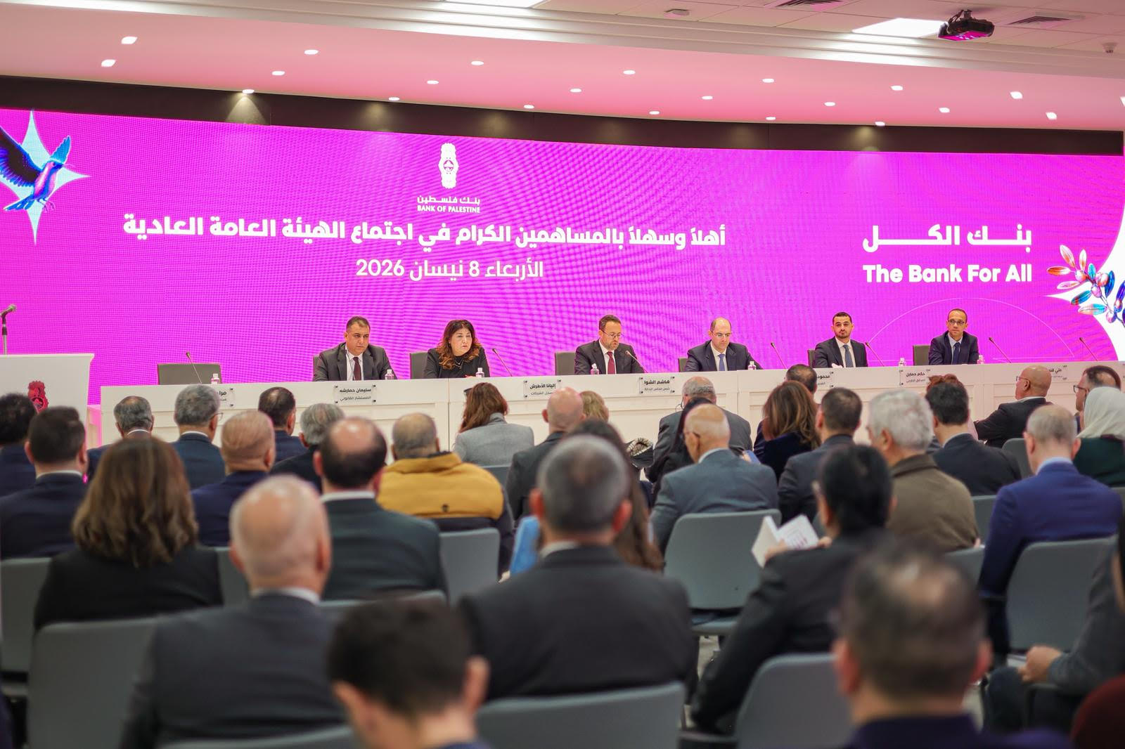 زمن برس، فلسطين: عقدت الهيئة العامة لبنك فلسطين اليوم الأربعاء 8 نيسان/أبريل 2026 اجتماعها السنوي العادي في مقر الإدارة العامة للبنك بمدينة رام الله، وذلك بحضور السيد هاشم الشوا رئيس مجلس الإدارة، والسيد محمود الشوا المدير العام، وأعضاء مجلس الإدارة، ومسجل الشركات في وزارة الاقتصاد الوطني، وممثلين عن المدقق الخارجي للحسابات، وسلطة النقد الفلسطينية، وبورصة فلسطين، وعدد كبير من المساهمين بنسبة نصاب بلغت 79.31%.