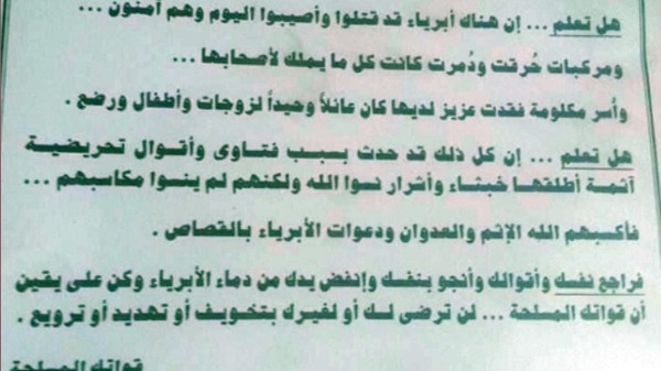 القاهرة: ألقى الجيش المصري منشوراً جديداً على معتصمي الإخوان برابعة العدوية قال فيه "من يقتل أخاه ليس شهيداً"، كما حضهم من خلال المنشور على فض اعتصامهم.