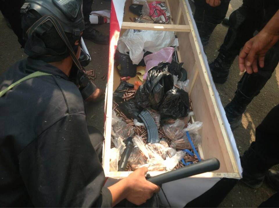 وأشارت الشرطة إلى أنها عثرت على الأسلحة داخل نعش خشبي في إحدى خيام الميدان.