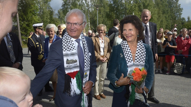رام الله: نشرت معظم الصحف السويدية الصادرة صباح اليوم الجمعة، صورة للملك كارل غوستاف والملكة سلفيا، أثناء زيارة لهما إلى مدينة هيرنوساند السويدية، وهما يتشحان كوفية فلسطينية كتب عليها عبارة "أقصانا ليس هيكلهم".