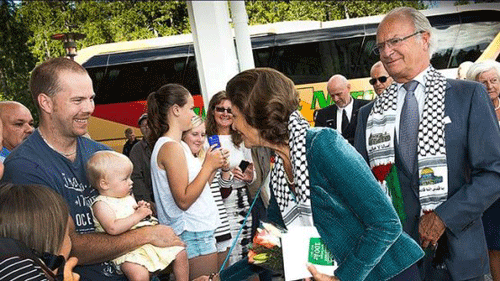 وذكرت وكالة الأنباء الرسمية أن الجالية الفلسطينية كانت قد أهدت الملك والملكة الكوفية الفلسطينية لدى زيارتها إلى المدينة تعبيرا عن تقديرها لما تلقاه من رعاية، وتثمينا لمواقف السويد حيال القضية الفلسطينية. إلا أن الصورة التي نشرت صباح اليوم في الصحف السويدية أثارات جدلا.