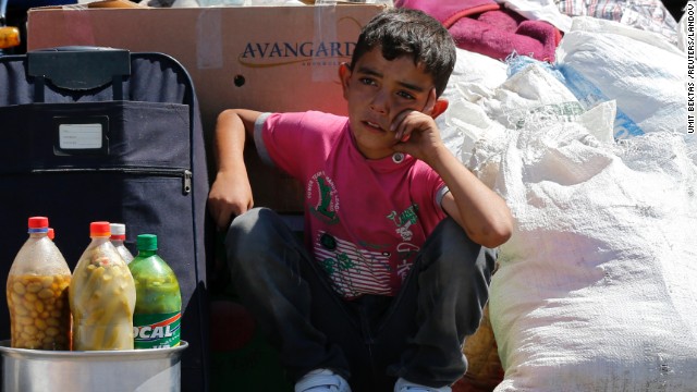 طفل يجلس بالقرب من أمتعة عائلته التي دخلت الحدود التركية بعد رحلة لجوء مريرة من سوريا.