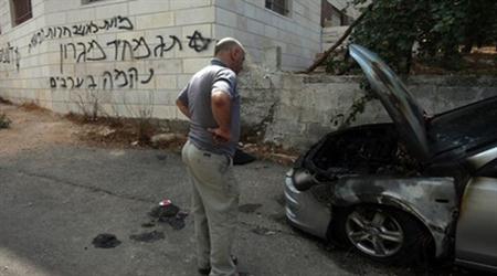 وقام المستوطنون في ساعات الفجر الأولى بإضرام النار في سيارتين من طراز "بيجو بارتنر" و"دايو لانوس" أثناء توقفهما أمام منزل القاضي، وكتبوا على الجدران شعارات معادية للمواطنين تشير الى أن هذا العمل العدواني نفذ انتقاما لمقتل الجندي الاسرائيلي في الخليل، وهرع سكان الضاحية لإخماد النيران المشتعلة في السيارتين والتي اتت عليهما بصورة شبه كاملة قبل وصول سيارات الدفاع المدني للمكان.
