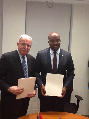 ووقع المالكي ممثلا عن دولة فلسطين، ووزير الخارجية والتجارة الدولية ممثلاً عن جمهورية غرينادا نيكولاس ستيل، ووزير الشؤون الخارجية والعبادة وبيير ريتشارد كاسيمر ممثلاً عن جمهورية هايتي، مساء اليوم السبت في مدينة نيويورك، اتفاقية اقامة علاقات دبلوماسية على مستوى السفراء، ووفقاً لأحكام إتفاقية ﭬيينا للعلاقات الدبلوماسية للعام 1961، أكد فيها الطرفان رغبتهم في تعزيز وتقوية علاقات التعاون، وأواصر الصداقة.