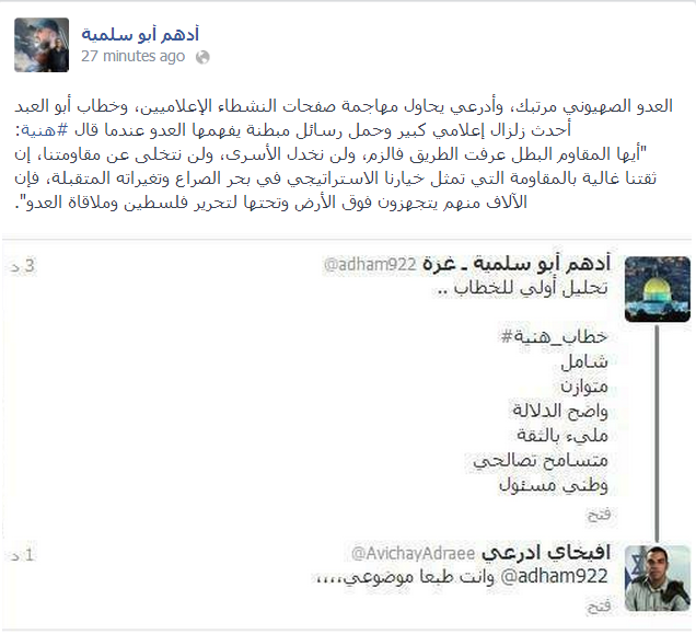 العدو الصهيوني مرتبك، وأدرعي يحاول مهاجمة صفحات النشطاء الإعلاميين، وخطاب أبو العبد أحدث زلزال إعلامي كبير وحمل رسائل مبطنة يفهمها العدو عندما قال #هنية: